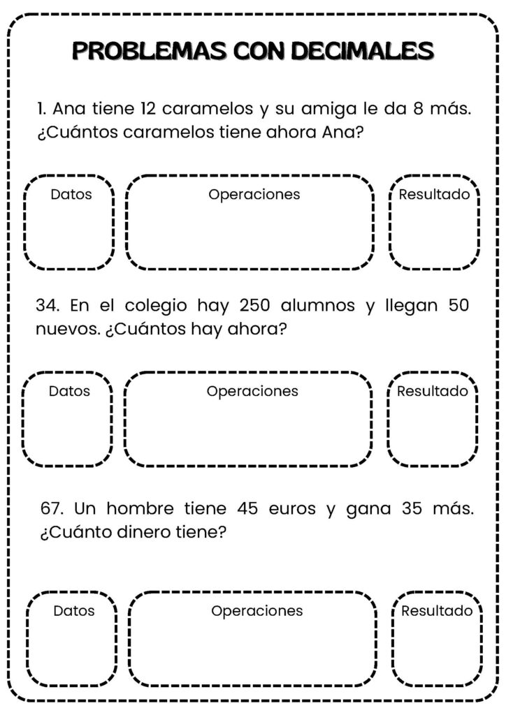 Contiene 100 problemas matemáticos con decimales graduados por nivel de dificultad.
