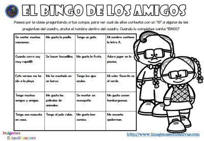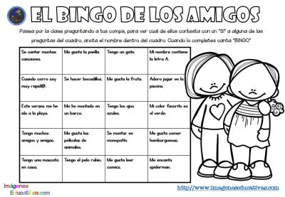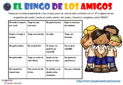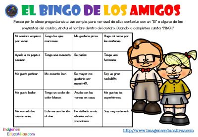 Una actividad muy interesante qué podemos llevar a cabo los primeros días de clase es el Bingo de los amigos, esta actividad consiste en repartir diferentes cartones de bingo a los alumnos y alumnas con multitud de preguntas de los temas que consideremos oportunos,