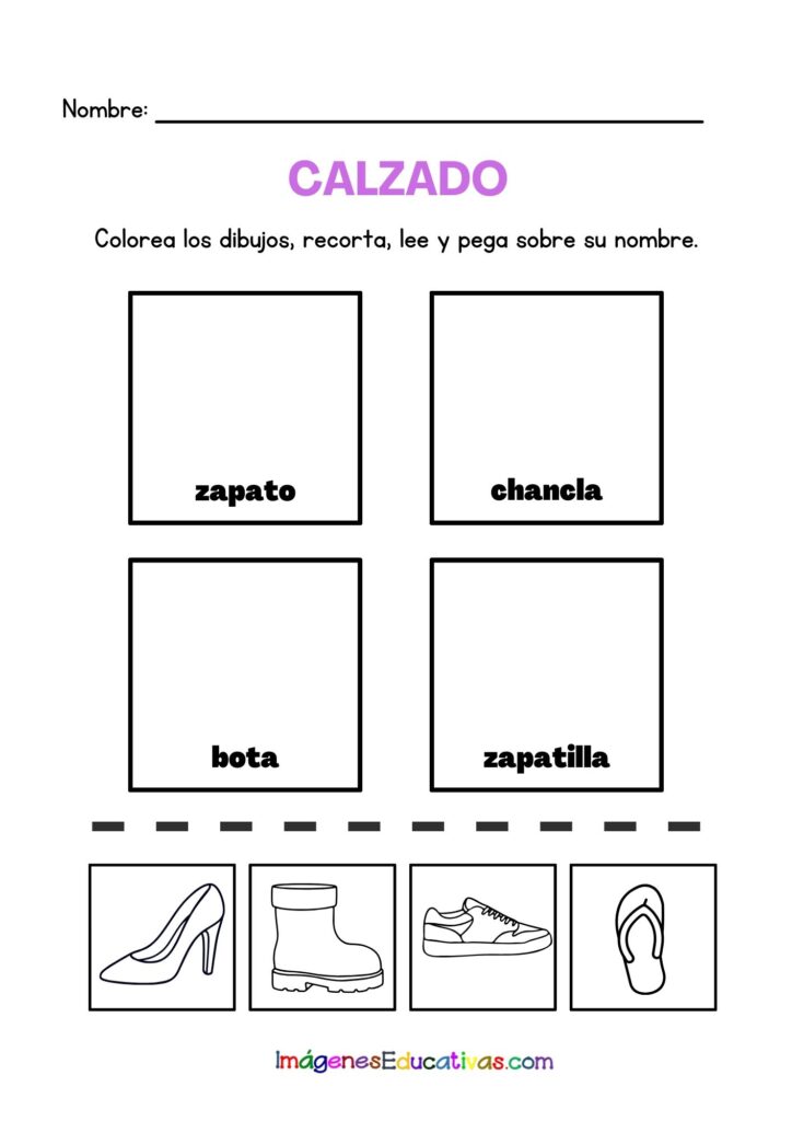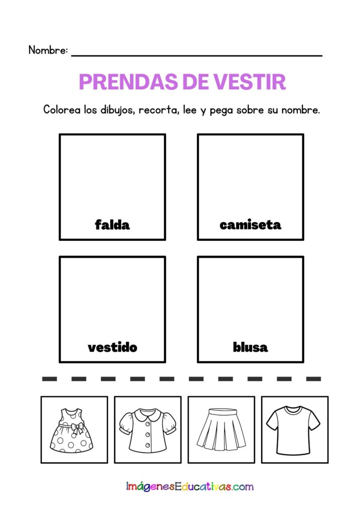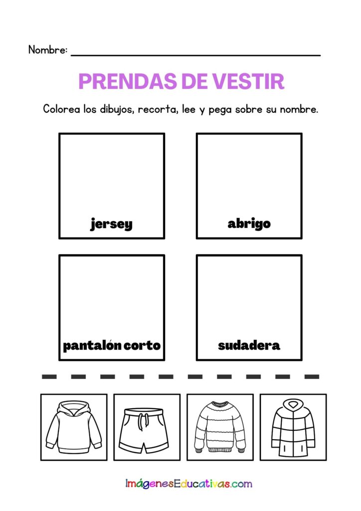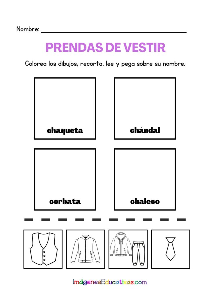 EDUCACIÓN INFANTIL, Lecto-Escritura actividad manipulativa, asociación imagen palabra, colorear, lectoescritura, prendas de vestir, vocabulario