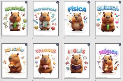 Portadas tipo pixar de capibara para todas las asignaturas
