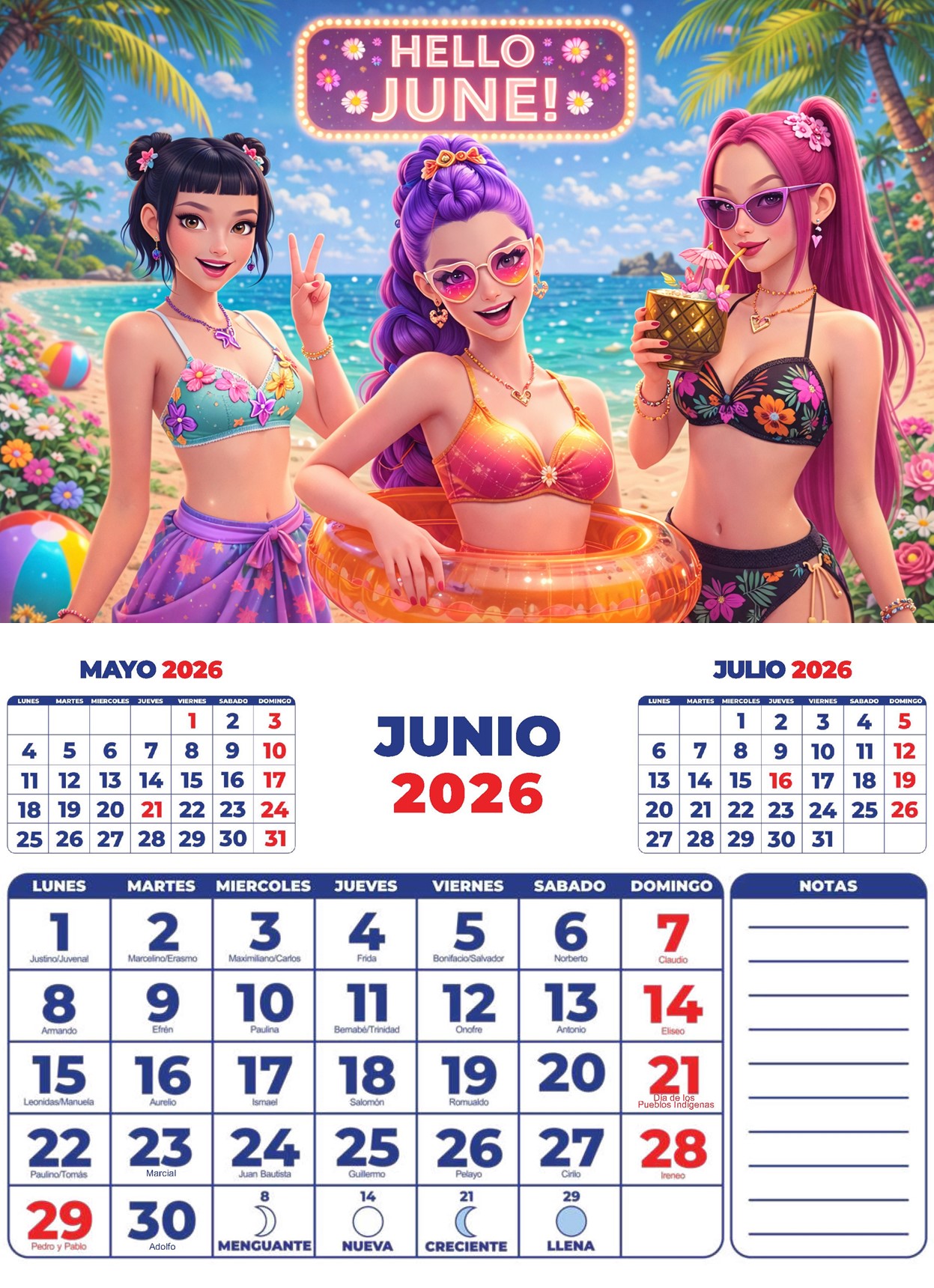 • Calendario PIKACHU 2026 con Santoral y Fases Lunares