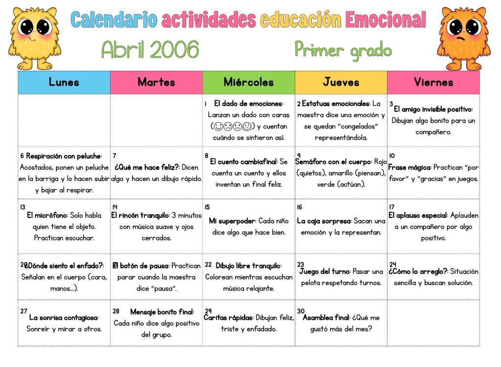 Este calendario propone una actividad sencilla para cada día lectivo del mes de abril, adaptada al nivel de primer grado. Las dinámicas están pensadas para ser breves, participativas y fáciles de aplicar, favoreciendo la creación de rutinas emocionales en el aula. Las actividades de inteligencia emocional para niños son fundamentales para el desarrollo personal y social del alumnado.