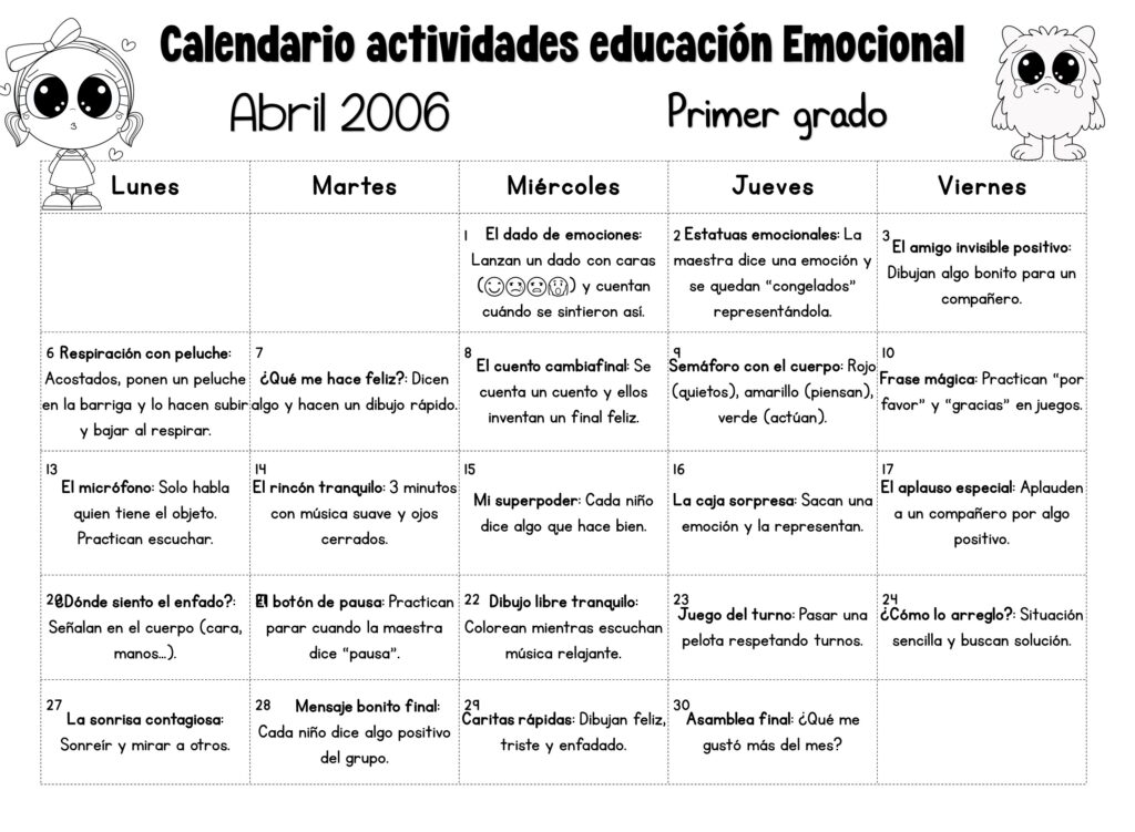 Calendario actividades emocionales Primer grado Abril