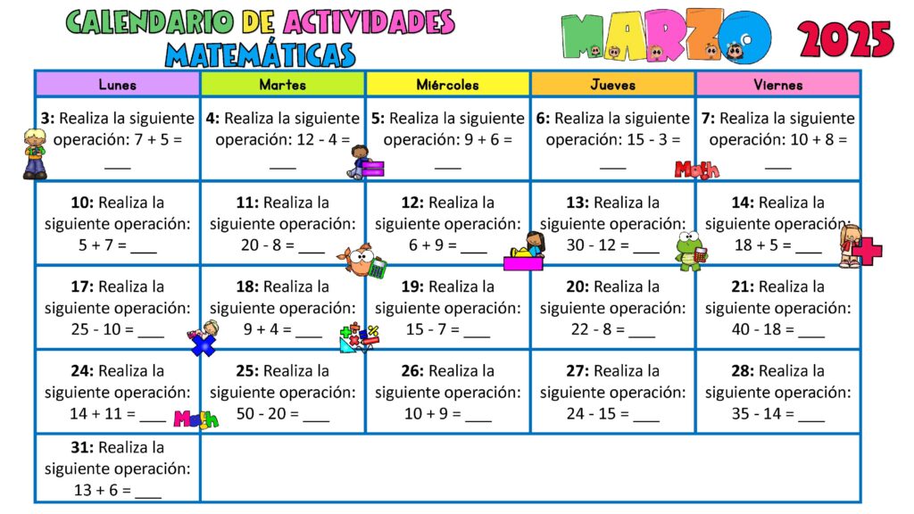 El calendario de actividades matemáticas para marzo 2025 es una herramienta organizativa y educativa que ayuda a los docentes y estudiantes a planificar y disfrutar del aprendizaje de las matemáticas de manera divertida y efectiva. Este calendario incluye una variedad de actividades diarias o semanales, como problemas matemáticos, juegos numéricos y desafíos lógicos, diseñados para reforzar conceptos clave. Si buscas más recursos para complementar este calendario, visita Imágenes Educativas, donde encontrarás plantillas descargables y propuestas creativas.