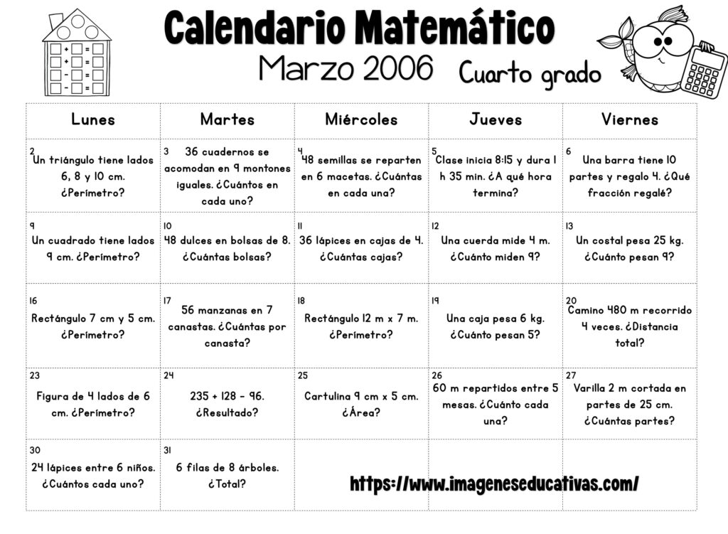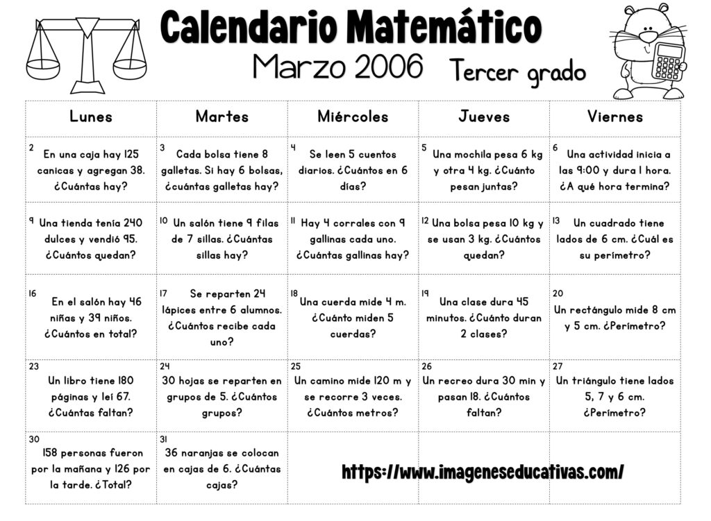 - Calendario matemático del mes de Marzo 3º y 4º Grado.