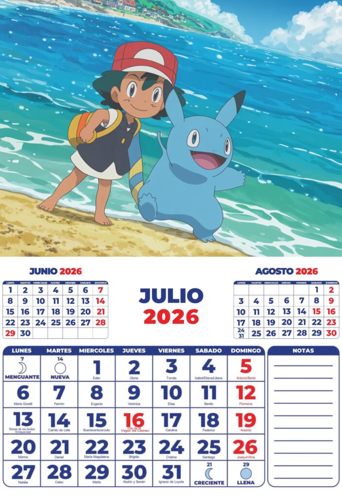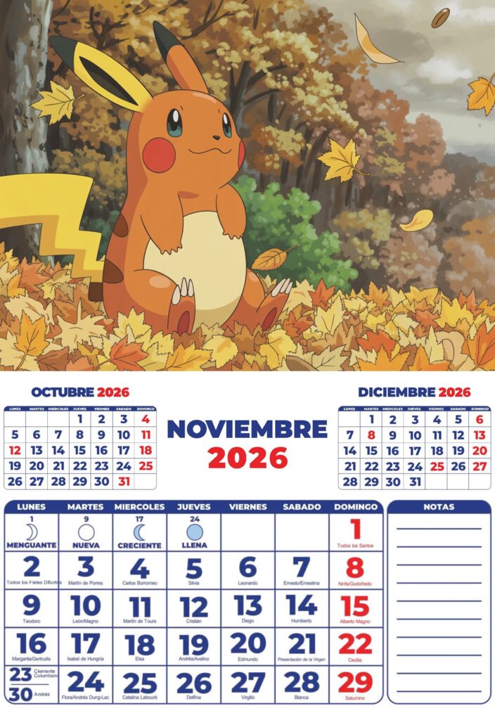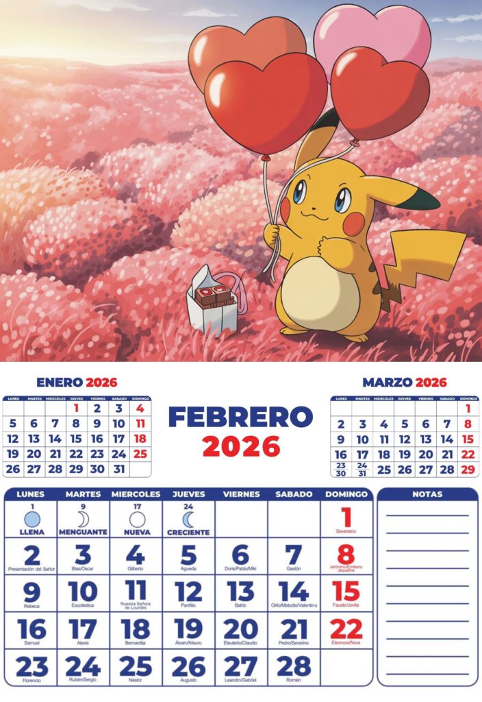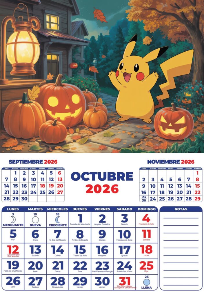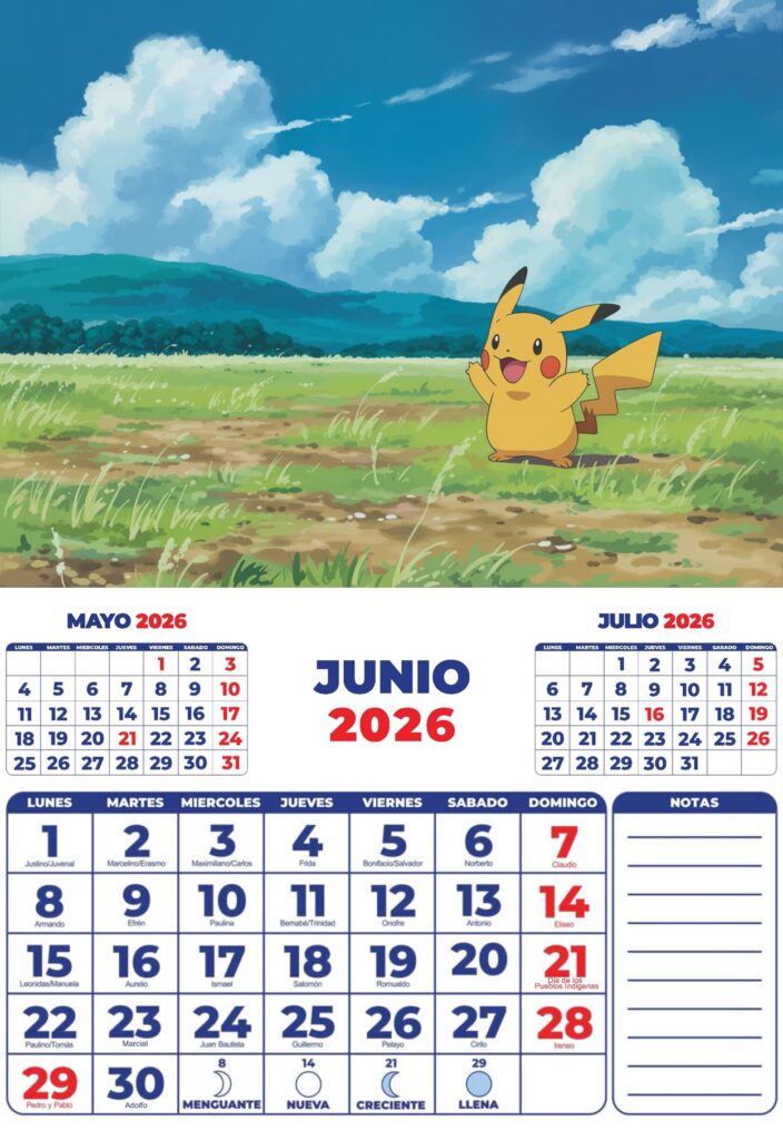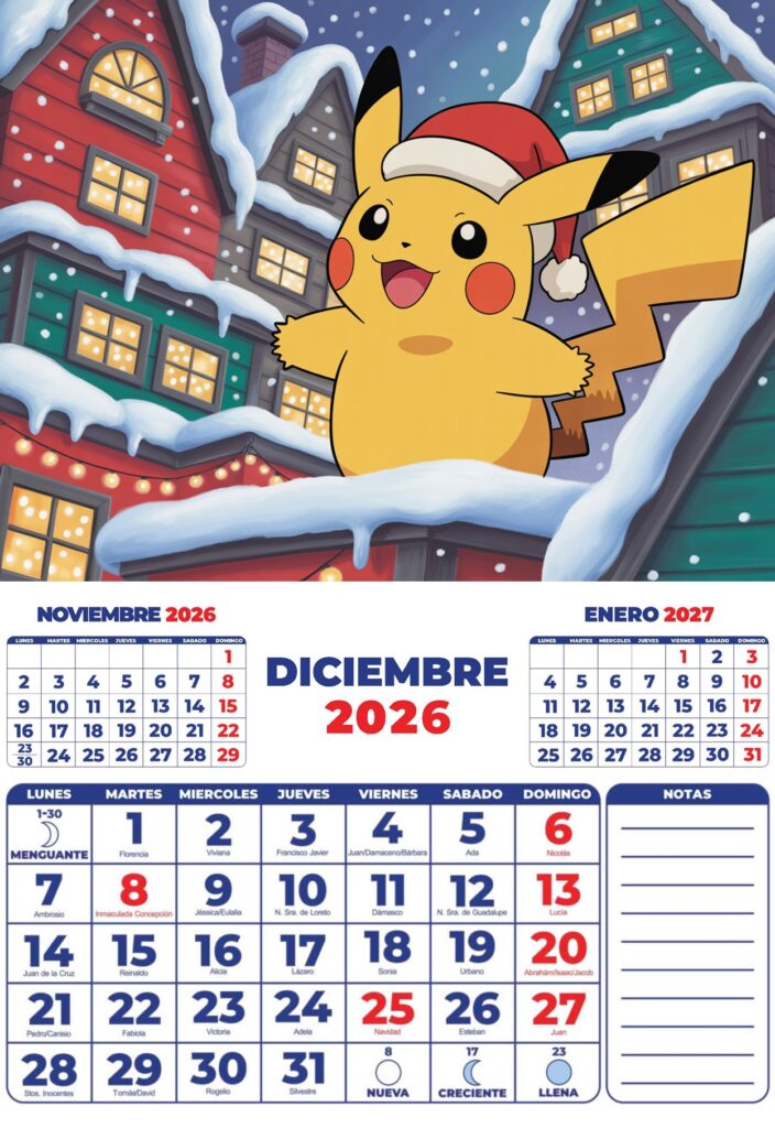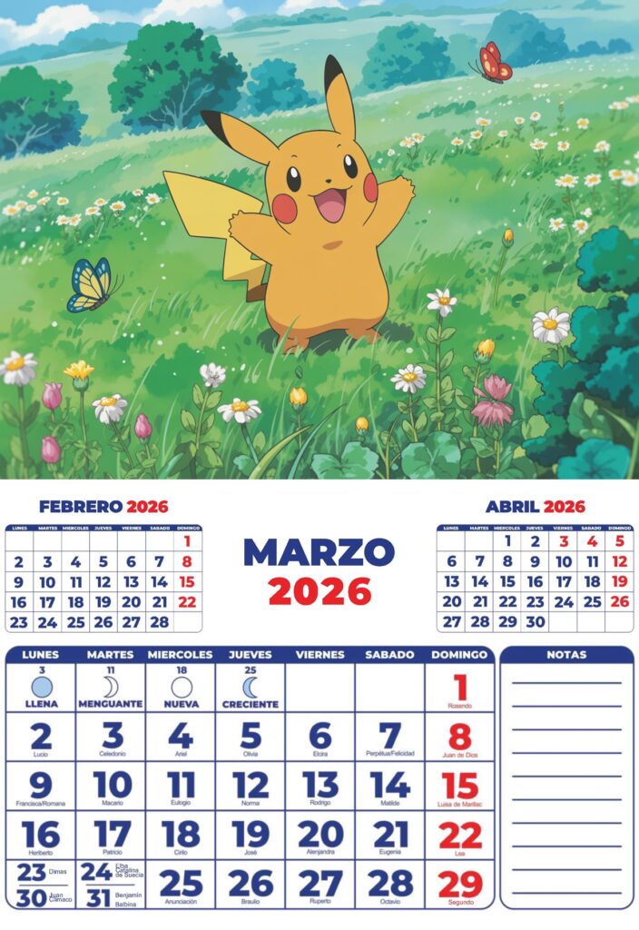 El Calendario PIKACHU 2026 con Santoral y Fases Lunares es un recurso educativo ideal para organizar el año de forma visual, divertida y didáctica. Diseñado especialmente para niños, familias y docentes, este calendario combina ilustraciones Pokémon con información útil para el día a día.