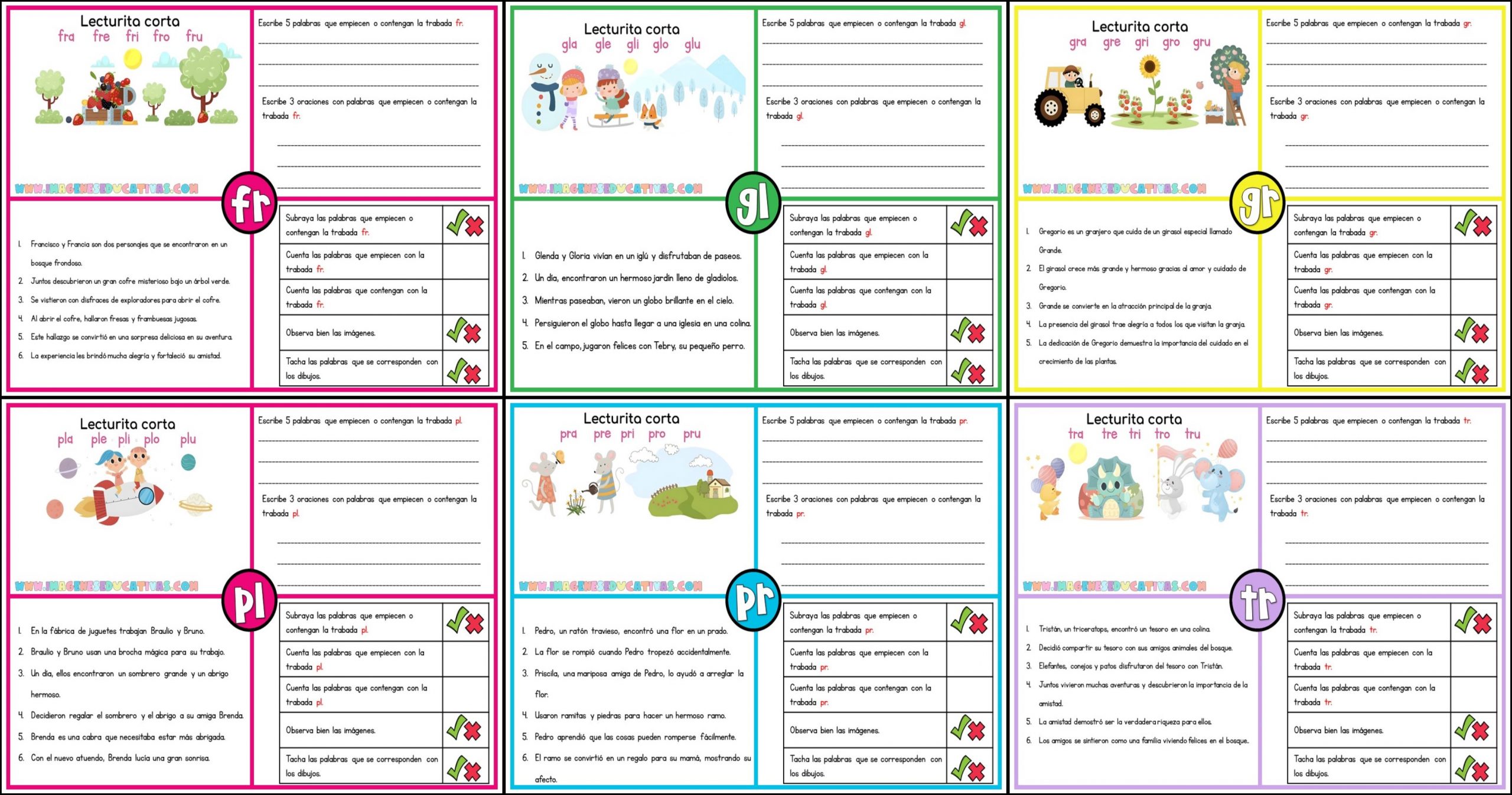 En Imágenes Educativas, estamos emocionados de lanzar un nuevo recurso que combina comprensión lectora con imágenes y sílabas trabadas, diseñado para captar la atención de los niños y facilitar el aprendizaje de la lectura. Este método innovador no solo ayuda a los pequeños lectores a familiarizarse con las sílabas trabadas de una forma más intuitiva y divertida, sino que también potencia su comprensión lectora a través del uso de imágenes que ilustran el texto.