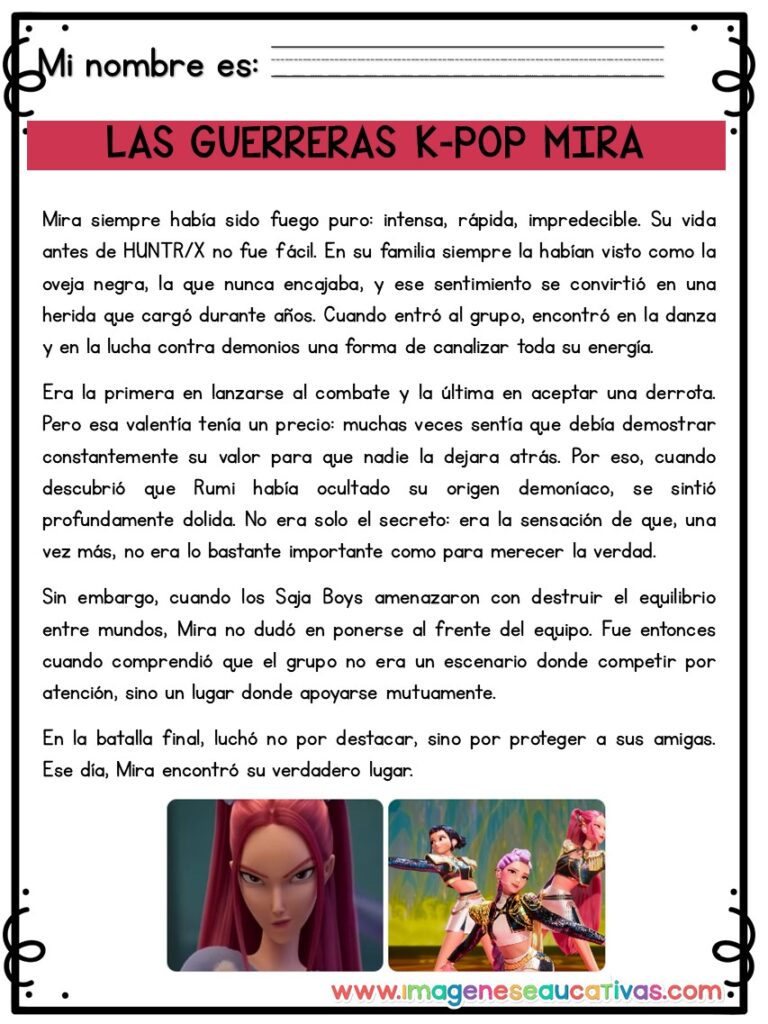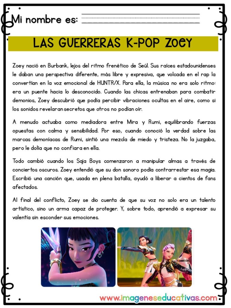 - Fichas para realizar descripciones de los personajes de las Guerreras K-Pop