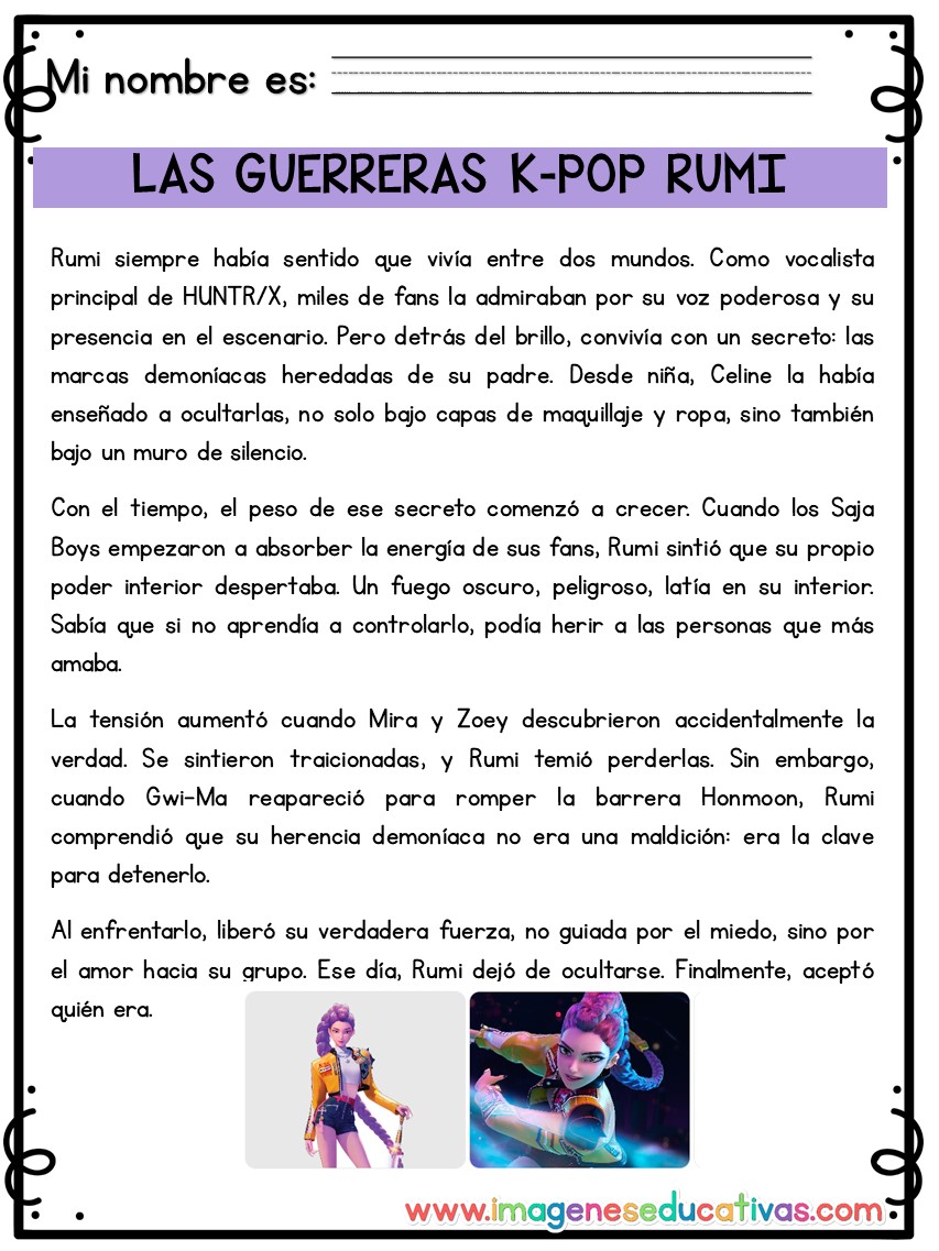 La Comprensión lectora: Las Guerreras K-pop- es un recurso educativo original que une la lectura con la emoción del universo musical del K-pop. A través de textos breves y dinámicos, los estudiantes se sumergen en las aventuras de Rumi, Mira y Zoey, las heroínas que combinan la música, la amistad y el poder de la imaginación para vencer los desafíos del día a día.