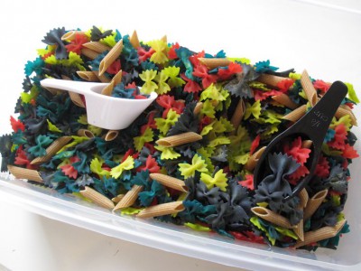- Agregar elementos adicionales: Elementos de cocina, como cucharas, embudos, recipientes medidores. También, si se quiere crear un Mundo Pequeño, podemos incorporar autos de juguete, animales plásticos, partes sueltas (elementos diversos), y podemos preparar nuestra Caja Sensorial inspirada en algún Tema en particular (las Estaciones, basarnos en algún libro, la playa, colores, entre otros).