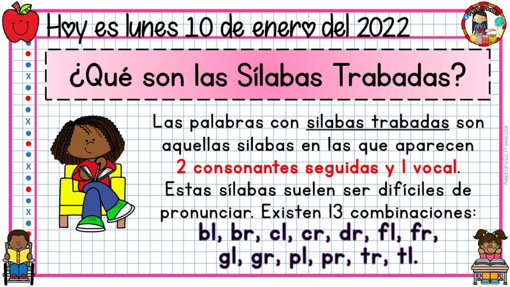 TRABADAS: Las sílabas trabadas son aquellas en las que en medio de la sílaba tenemos “l” o “r”. Son sílabas trabadas, por ejemplo: pla, bre, fra, pri, etc.