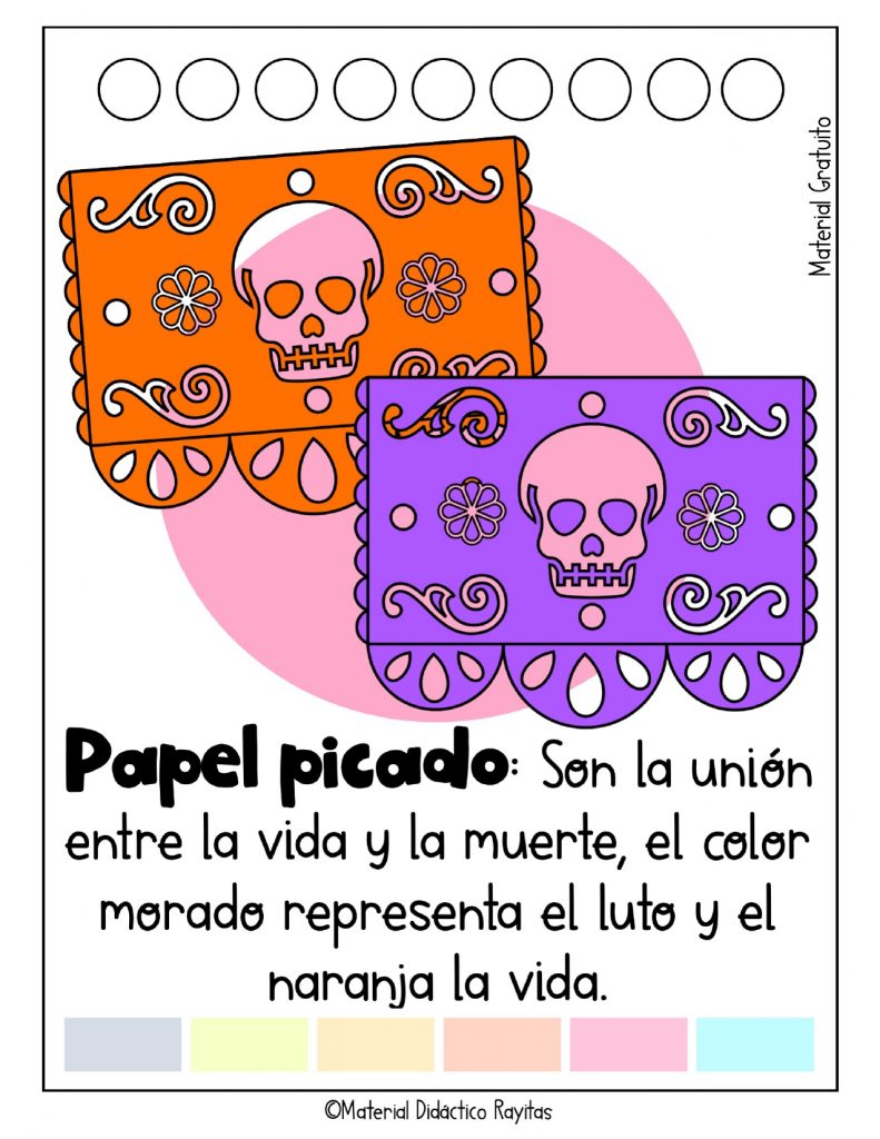 Papel picado: El papel picado es un tipo de papel picado con diseños coloridos que se usa para decorar la ofrenda. Los colores y diseños representan la alegría y la celebración de la vida.