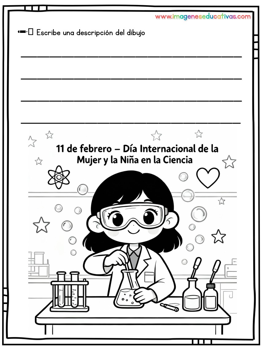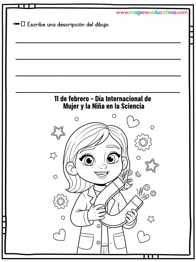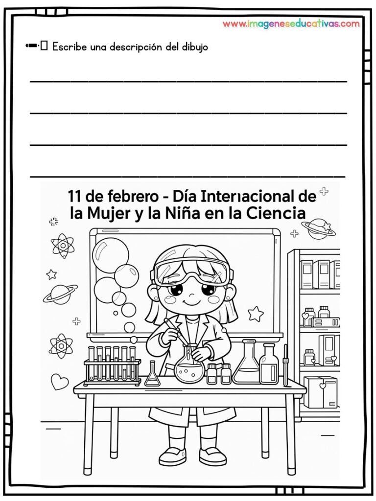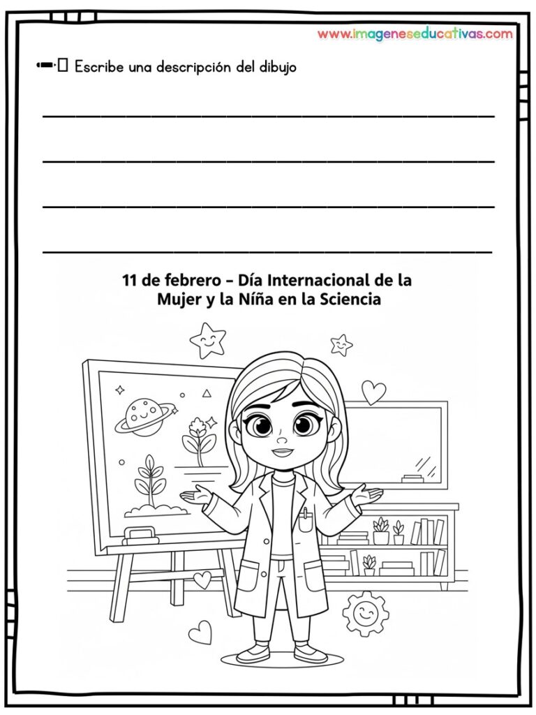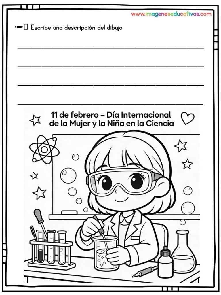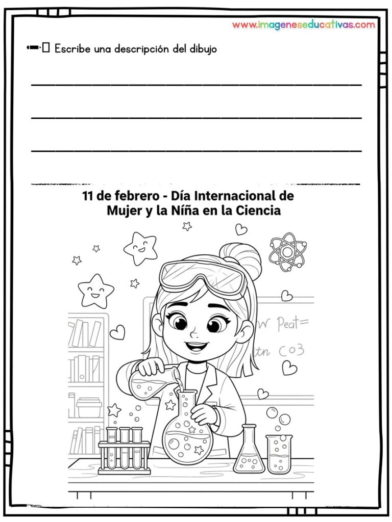 Los dibujos para colorear y describir por el Día Internacional de la Mujer y la Niña en la Ciencia son un recurso educativo ideal para conmemorar el 11 de febrero, fomentando la igualdad de género y visibilizando el papel de las mujeres en la ciencia. A través de ilustraciones adaptadas, el alumnado colorea y describe escenas relacionadas con la investigación, desarrollando tanto la creatividad como la expresión oral y escrita.
