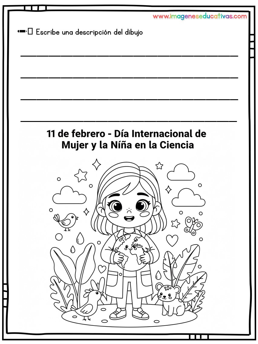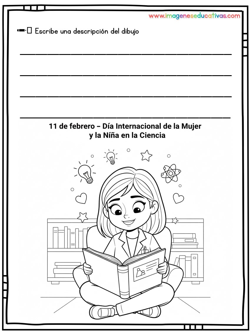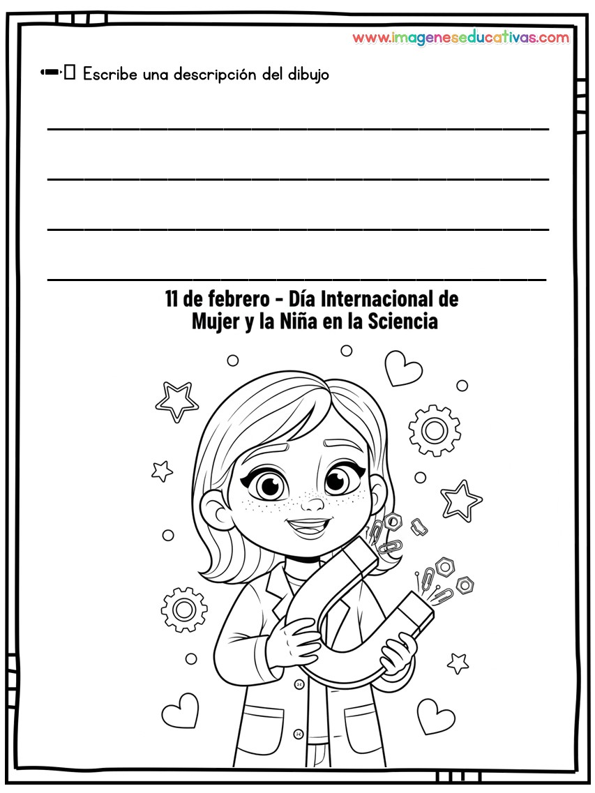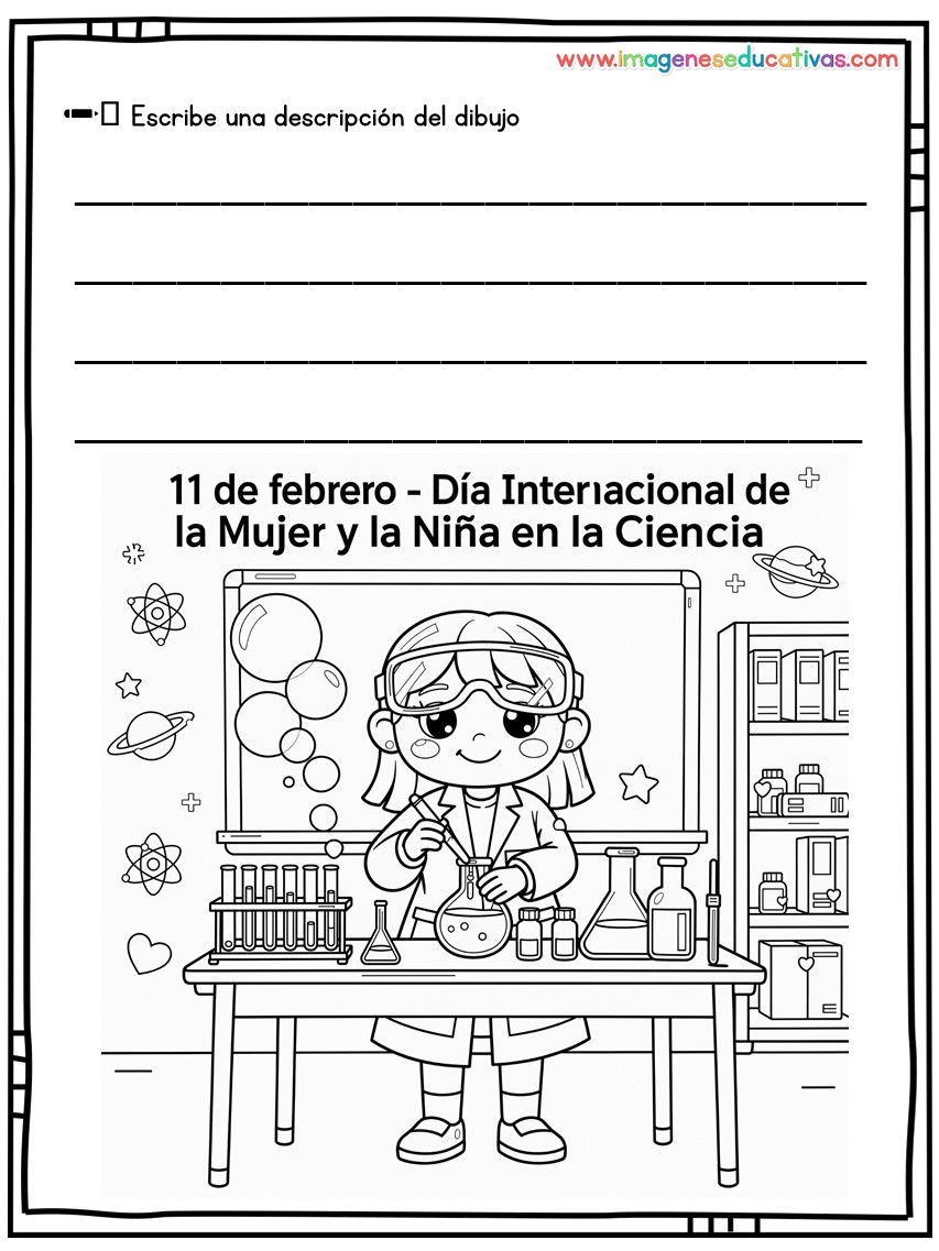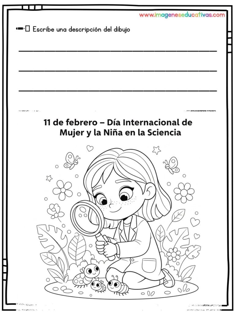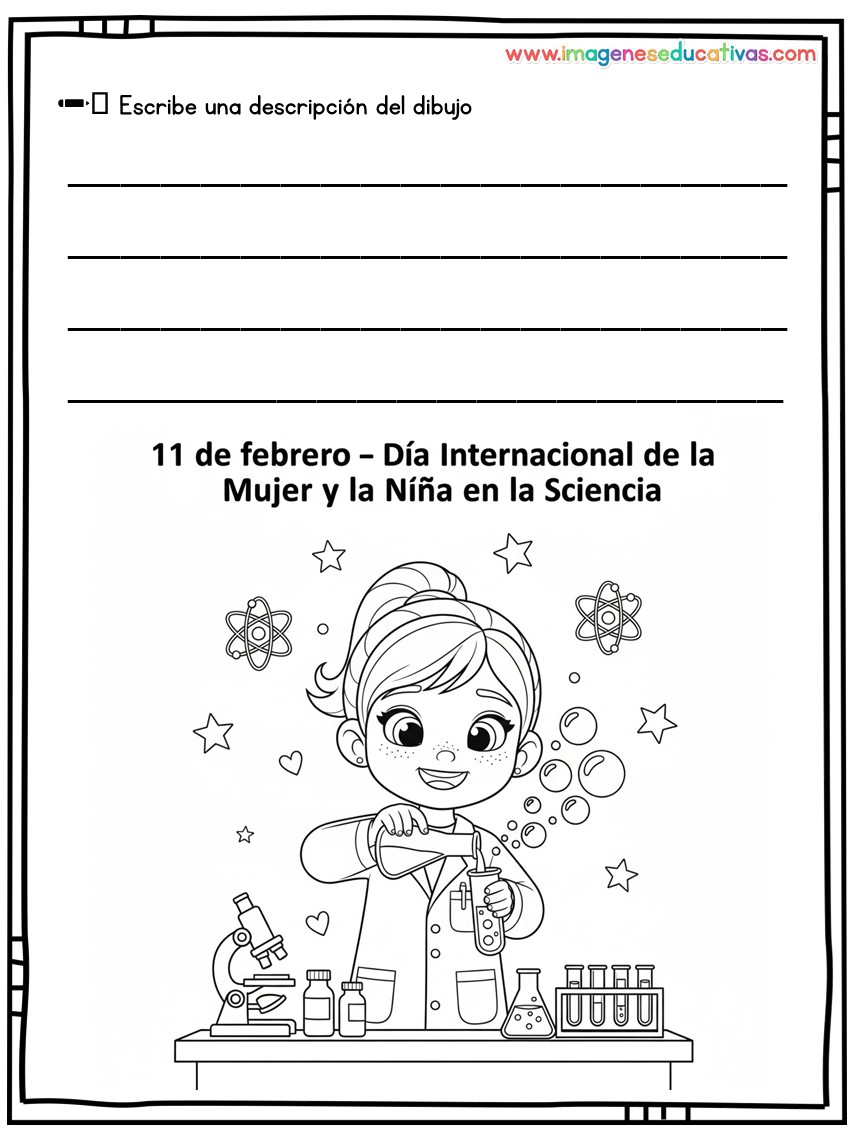 Los dibujos para colorear y describir por el Día Internacional de la Mujer y la Niña en la Ciencia son un recurso educativo ideal para conmemorar el 11 de febrero, fomentando la igualdad de género y visibilizando el papel de las mujeres en la ciencia. A través de ilustraciones adaptadas, el alumnado colorea y describe escenas relacionadas con la investigación, desarrollando tanto la creatividad como la expresión oral y escrita.