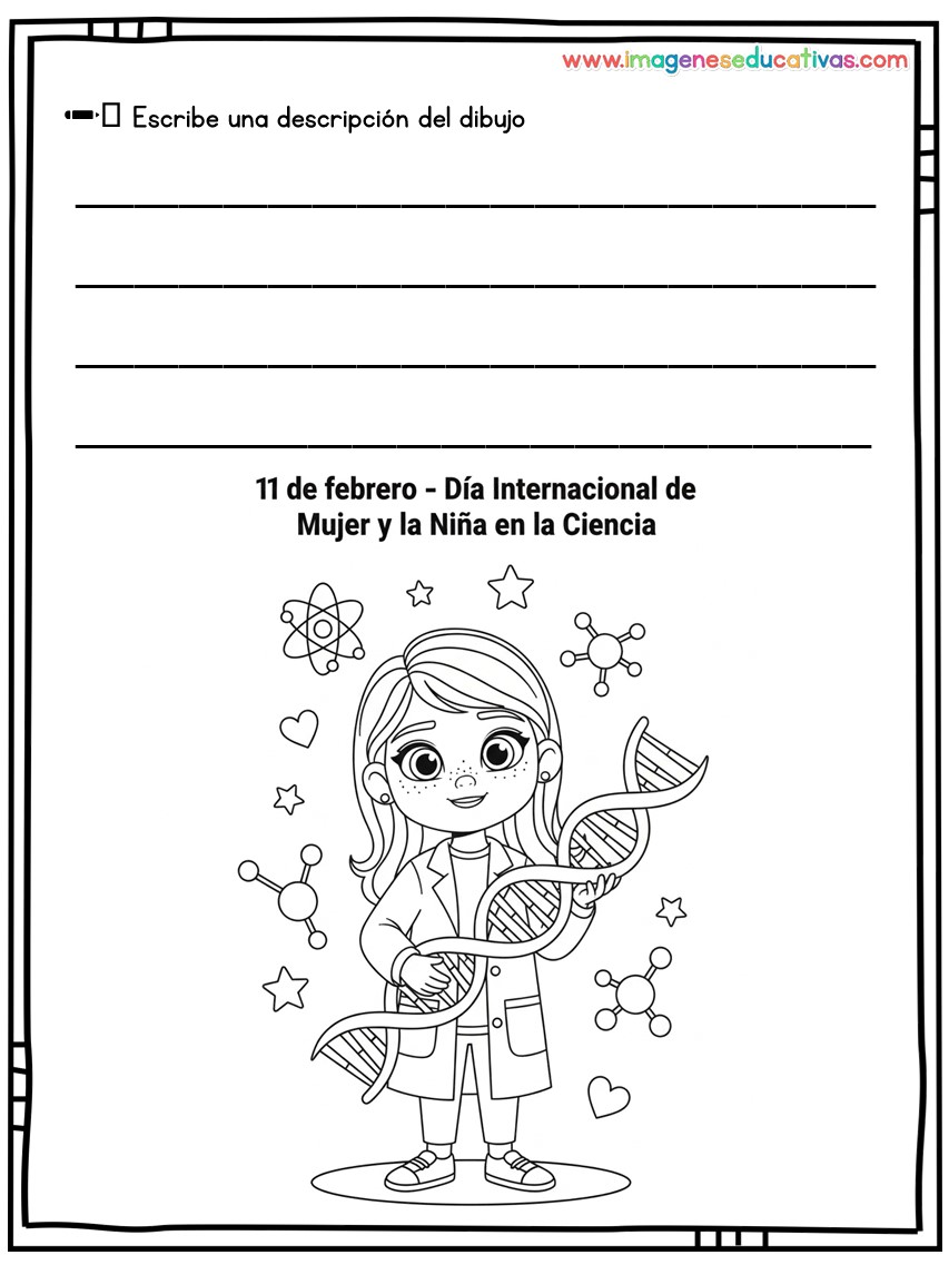 📄 Material imprimible disponible en dibujos del Día de la Mujer y la Niña en la Ciencia.