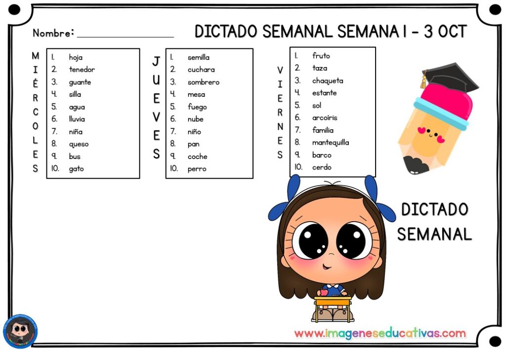 El Dictado semanal mes de octubre 2025 nivel inicial es un recurso creado para apoyar a los estudiantes que comienzan a dar sus primeros pasos en la lectoescritura. Con frases cortas, palabras sencillas y temáticas cercanas a su entorno, estos dictados ayudan a reforzar la ortografía básica y la escritura correcta de manera gradual y motivadora.