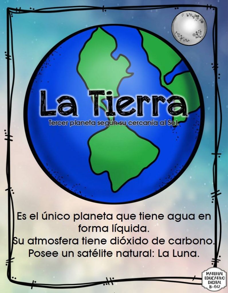 Es el único planeta conocido sobre el que hay agua líquida y vida. Es el Planeta Azul, porque visto de lejos parece azul. Está situada en un lugar perfecto en el espacio, si estuviera más cerca del Sol tendría mucho calor, y si estuviera más lejos haría mucho frío para que hubiera vida.El agua es vida porque los hombres, los animales y las plantas necesitan agua para vivir.La Tierra gira sobre si misma, dando lugar a los días y las noches.