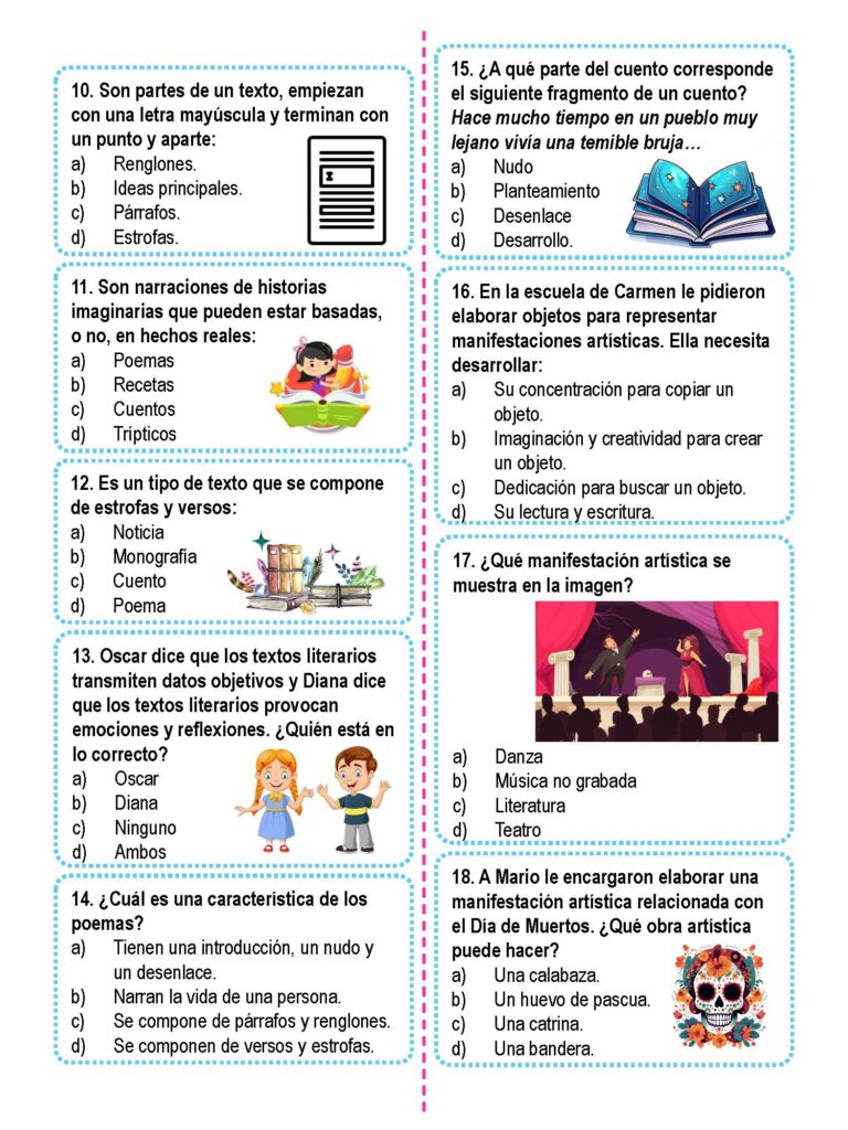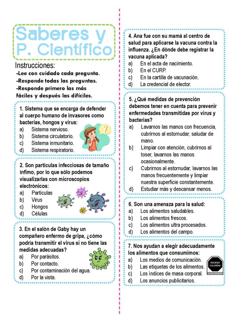 Examen estructurado por campos formativos (Lenguaje, Pensamiento Matemático, Exploración del Mundo, Artes, Vida Saludable, etc.).