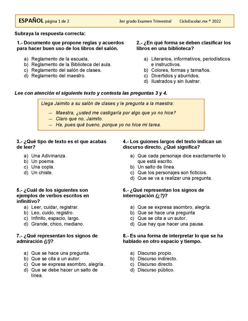 EXAMEN TRIMESTRE BLOQUE I 3° PRIMARIA CICLO ESCOLAR 2022-2023