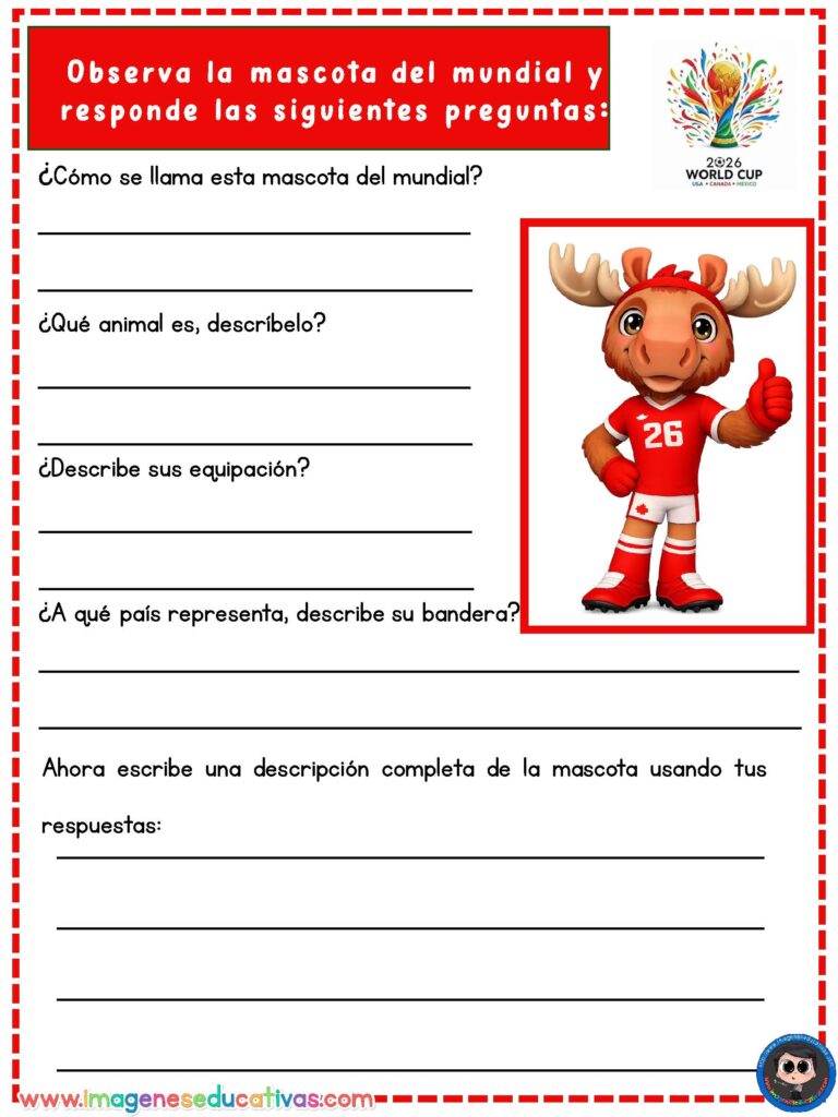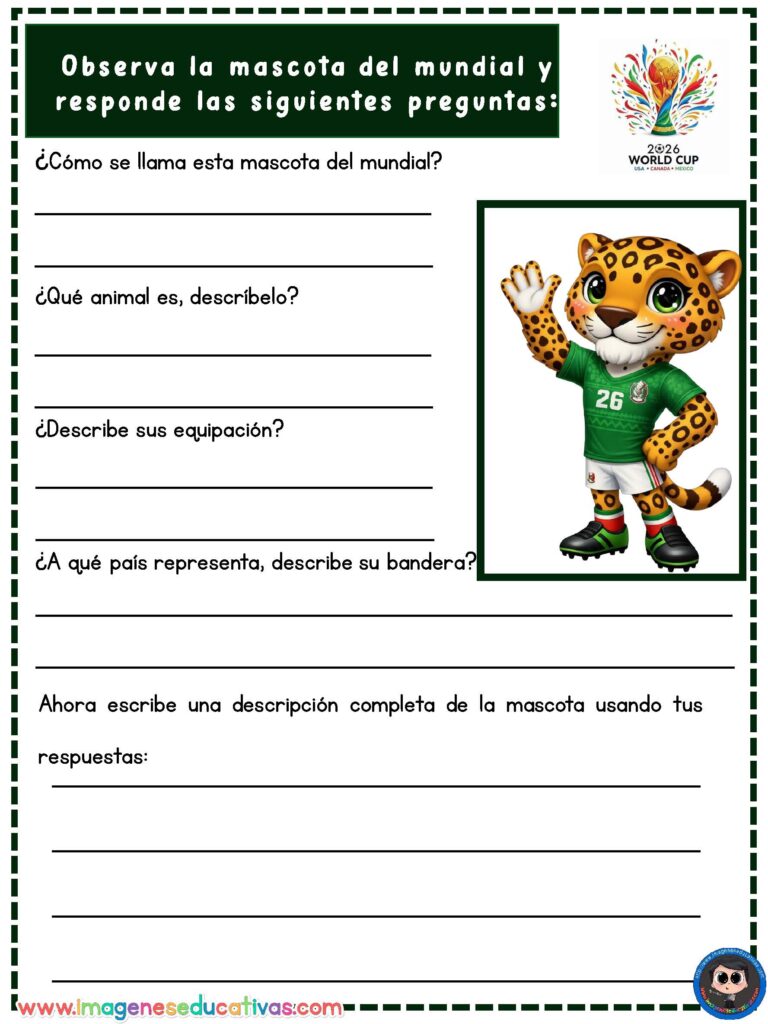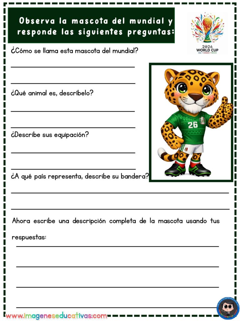 Las Fichas descriptivas Mascotas del Mundial de Fútbol son un recurso educativo ideal para trabajar la comprensión lectora y la expresión escrita a través de una temática muy motivadora para el alumnado. Las mascotas de los mundiales, con sus diseños llamativos y características únicas, permiten crear actividades atractivas que despiertan el interés de los estudiantes. En actividades de comprensión y escritura para primaria puedes encontrar recursos similares para el aula.
