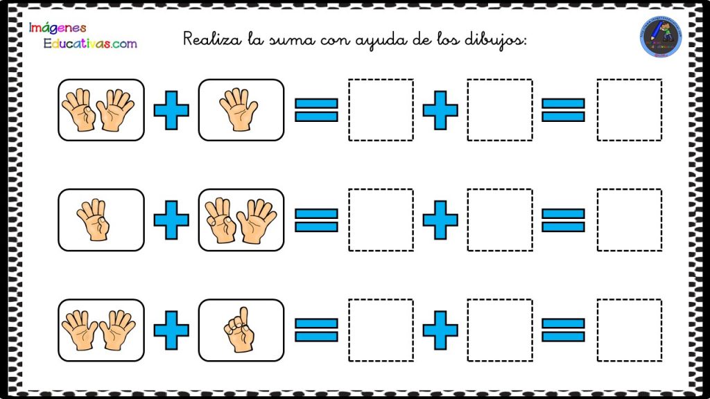 Original actividad para iniciarse en la suma en Infantil. Nuestros peques siempre empiezan a contar y a sumar con los dedos, por ese motivo os hemos preparado estas fichas de sumas con dibujos que les van a facilitar la tarea.