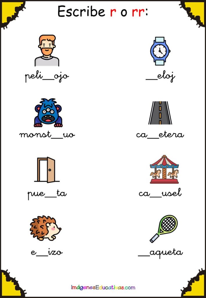 En esta actividad de ortografía, los alumnos tendrán la oportunidad de practicar el uso correcto de las letras «R» y «RR» al completar palabras con la letra adecuada. Para hacerlo más divertido y comprensible, contarán con la ayuda de dibujos que les guiarán en la elección correcta de la letra.