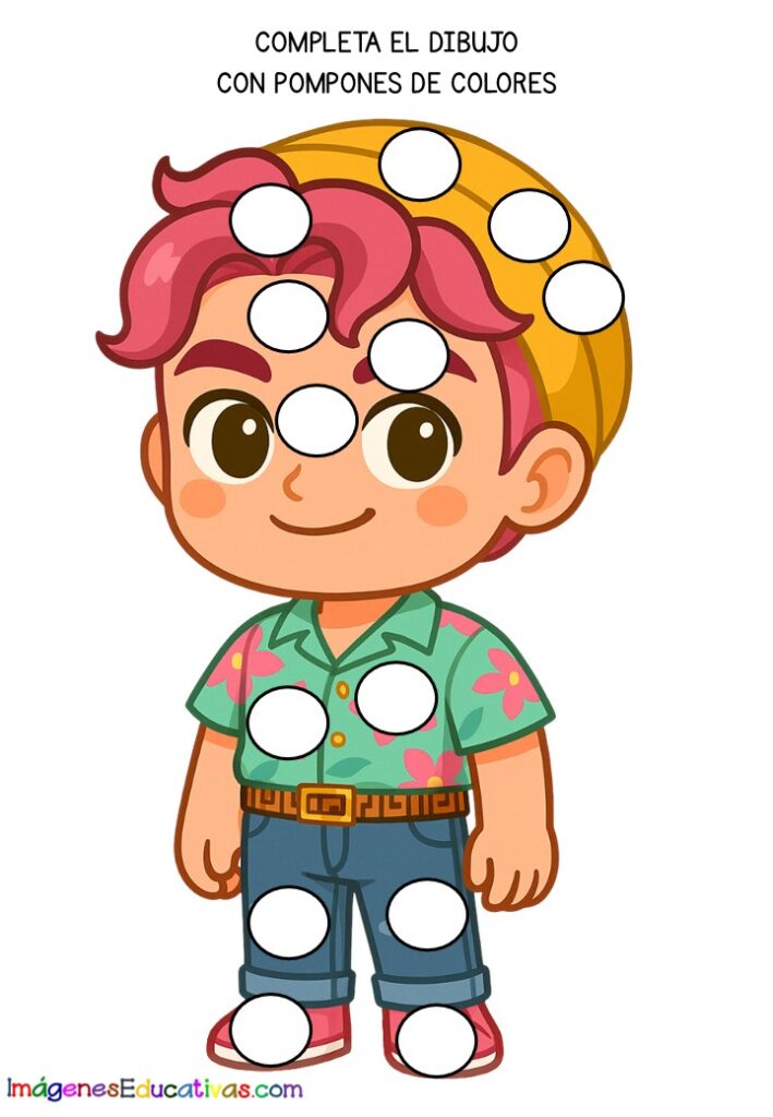 Esta actividad consiste en rellenar las ilustraciones con pequeños pompones siguiendo las indicaciones de color o dejando que los alumnos elijan libremente. La textura, el color y la manipulación de los pompones convierten cada lámina en un verdadero ejercicio sensorial y artístico, fomentando la imaginación y el gusto por el arte desde edades tempranas.