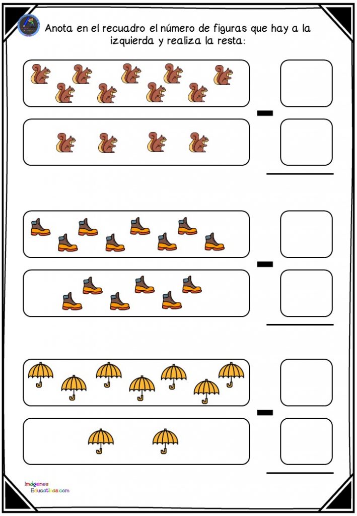 Las sumas y restas son las primeras operaciones matemáticas que aprendemos; algunos niños incluso aprenden antes de comenzar la escuela primaria de forma autodidacta. Aprender a restar resulta más sencillo con fichas como éstas en la que cuentan con la ayuda de pistas visuales.
