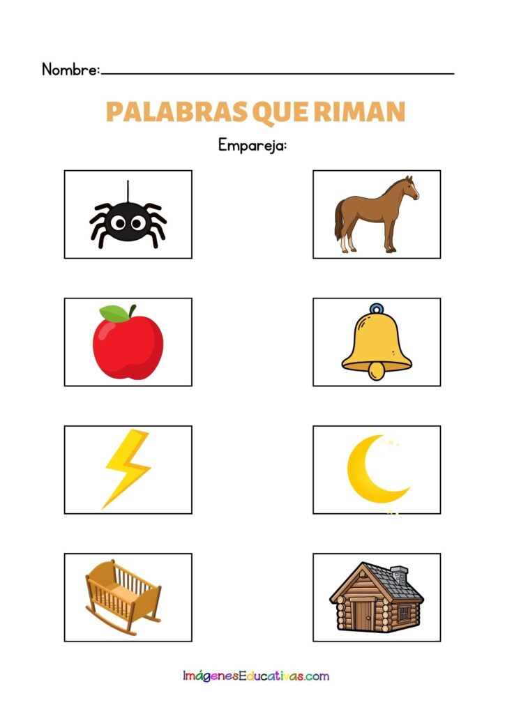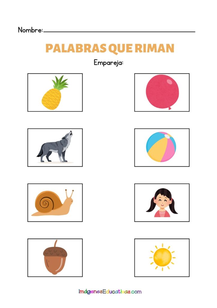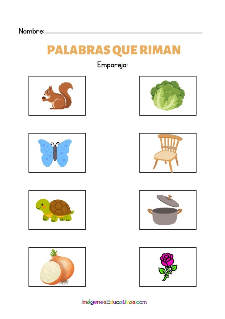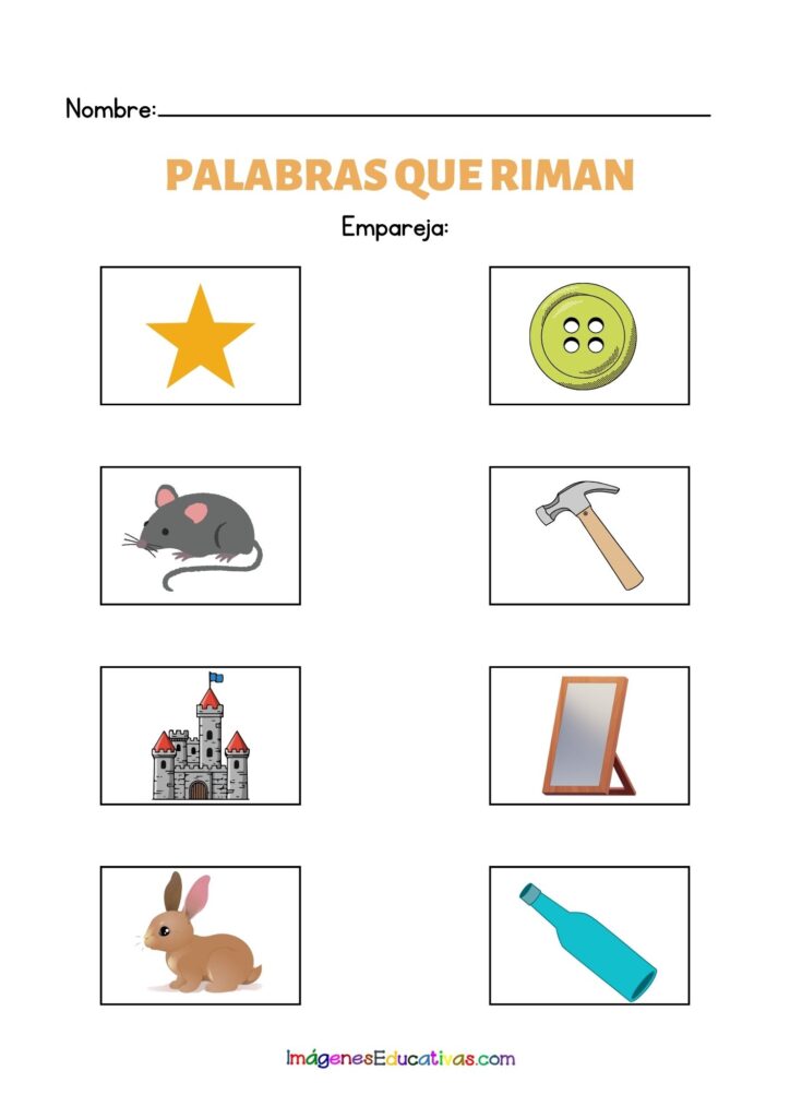Cada ficha presenta una serie de imágenes que representan diferentes palabras, y la actividad consiste en que los alumnos emparejen aquellas que rimen entre sí. Este tipo de ejercicios no solo ayuda a reconocer patrones sonoros, sino que también fomenta la atención, la discriminación auditiva y el vocabulario.