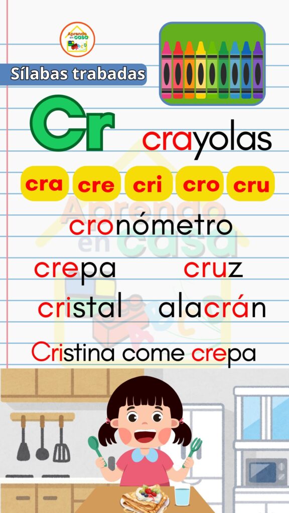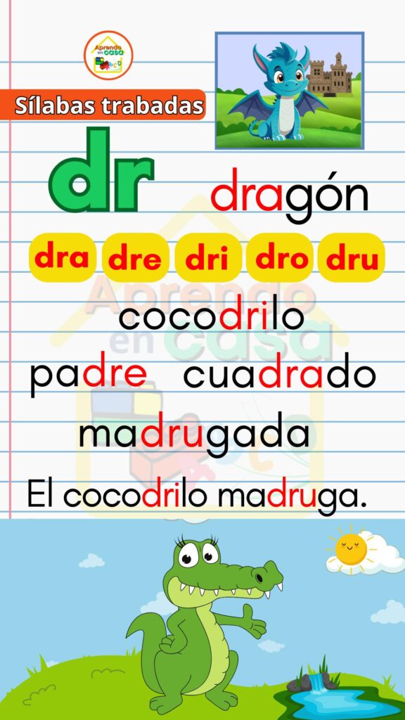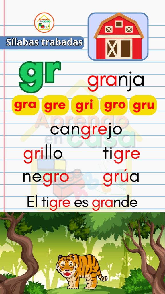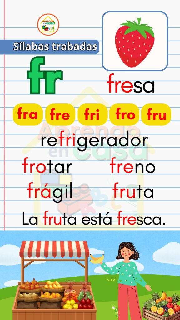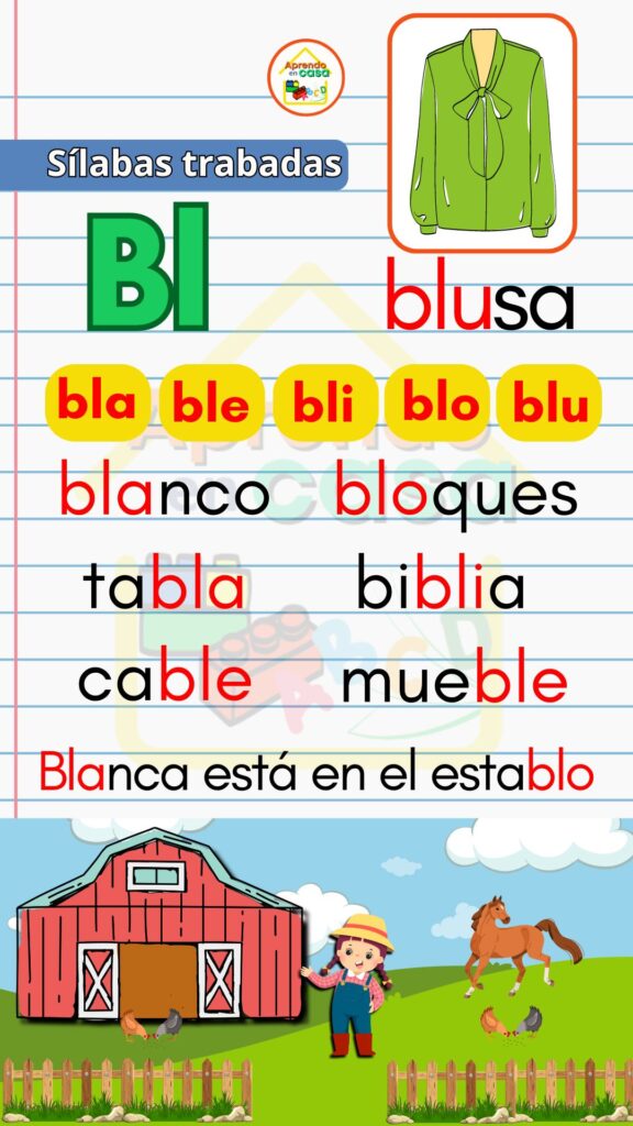 Los Apoyos visuales de sílabas trabadas son un recurso didáctico diseñado para ayudar a los niños a reconocer, leer y escribir sílabas trabadas de forma clara y divertida. Estas combinaciones consonánticas (como pla, tra, gru, cla, flo) suelen representar un reto en el proceso de lectoescritura, por lo que los apoyos visuales facilitan su aprendizaje mediante imágenes, colores y ejemplos sencillos.