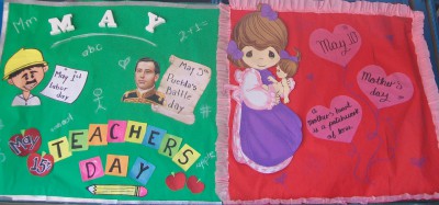 Periódico mural correspondiente al mes de mayo en el cual destacan las principales fechas alusivas como son: 1º de mayo día del trabajo, 5 de mayo día de la batalla de puebla, 10 de mayo día de la madre y 15 de mayo día del maestro.